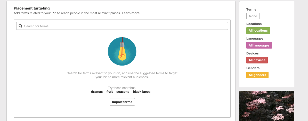 - Use the Pinterest suggestions to find terms you may not have thought of. These suggestions look at what you have typed out and see what Pinterest users are searching for and pinning, so these suggestions are great guidance for your campaign terms.