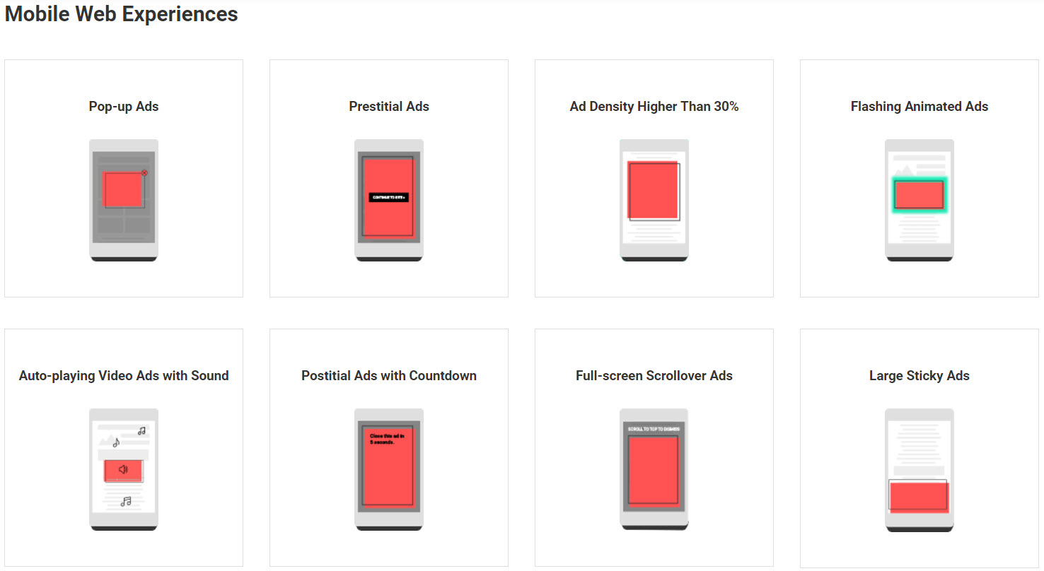 That’s not to say you shouldn’t run ads, but what you should do is get ahead of these browser restrictions by seeing if you’re using any of the least preferred ad experiences from the Initial Better Ad Standards. The Coalition for Better Ads uses cross-industry expertise and consumer insight to create new global standards for online advertising that better addresses consumers wants and expectations of advertisers. According to the www.betterads.org/standards site, avoid the following types of ads: