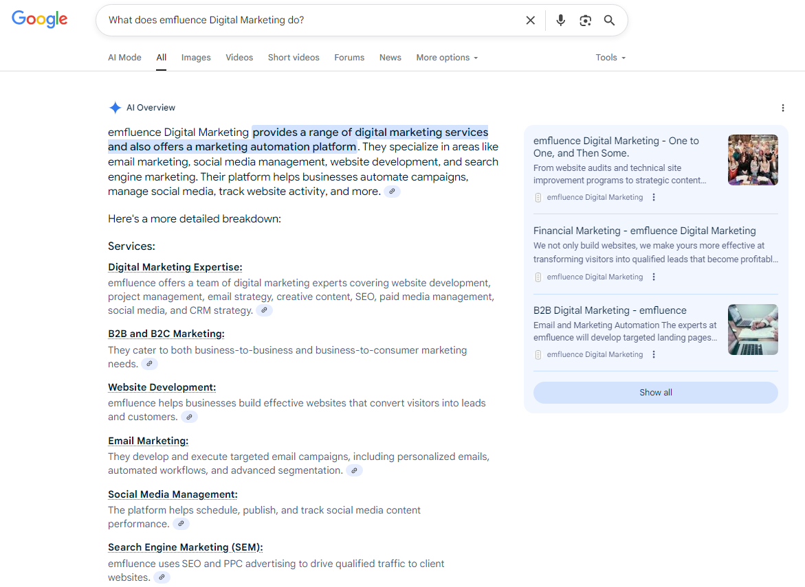 Whether you’re looking for a content audit or guidance on schema implementation , emfluence can help you show up where it matters most.