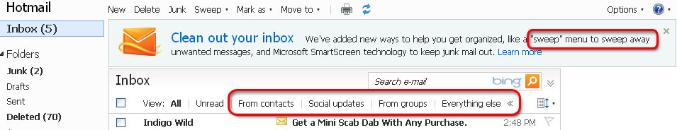 For those who haven’t heard about the upcoming changes to MSN’s Hotmail services, they’ve announced that in order to provide a better inbox for the user, they’re adding features that will help users keep noise out and relevant messages in. Changes include things like a Highlights page that shows users an overview of new messages from those on their contacts list or their social media updates and Filtered Views and Quick Views in the actual Inbox, using similar categories. Note that there isn’t a category for special offers from the email marketing lists the user may subscribe to. The Highlights feature is similar to what Yahoo! did when they rolled from Yahoo! Classic to their newer platform awhile back. For me, anecdotally, it just means one more click before I hit the actual Inbox in its pure form.