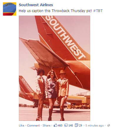 There are also social media created events, like “Follow Friday” and Throwback Thursday. If you see your audience honoring these social events, why not find a way to bring your brand in on the celebration? Southwest Airlines posted a great “Throwback Thursday” post of a stellar 70’s promotional photo and asked for engagement by letting their audience provide the caption.