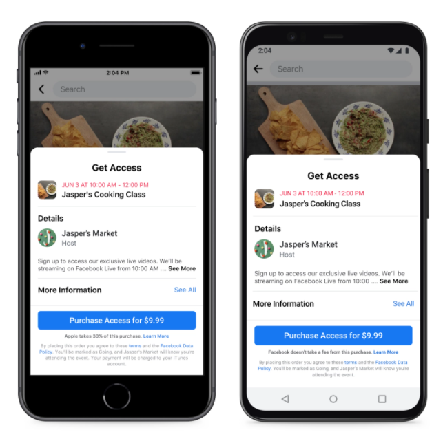 Paid Online Events allows businesses and others (creators, educators, media publishers, etc.) to set up paid events or classes online and keep 100% the revenue themselves (except on iOS, where event hosts must give up the 30% “App-Store tax,” as Facebook calls it). Hosting, promotion, ticket sales, and payment processing are all included. For those who’ve used tools like Eventbrite in the past, that could be a nice savings on ticketed events.