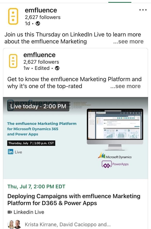 Obviously, we have to touch on emfluence, especially with all the exciting new marketing ideas that have been worked into our strategy lately. LinkedIn is a major platform for B2B business and communication. emfluence has been tapping into LinkedIn Live to help others learn more about the emfluence Marketing Automation Platform for Microsoft Dynamics. We’ve featured pre-recorded demos with live sales rep Q&As and even had our CEO step in and share, generating all sorts of playback content for audiences.